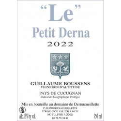 Le Petit Derna, c'est le premier vin du Domaine. C'est l'appellation IGP pays de Cucugnan. Une gourmandise à prendre à l'apéritif et à conserver pour le repas, même le midi pendant la semaine... assurément vous n'aurez aucune lourdeur. Un gout de reviens-y à la fin de la bouteille assuré ! Le Petit Derna ça pinotte !